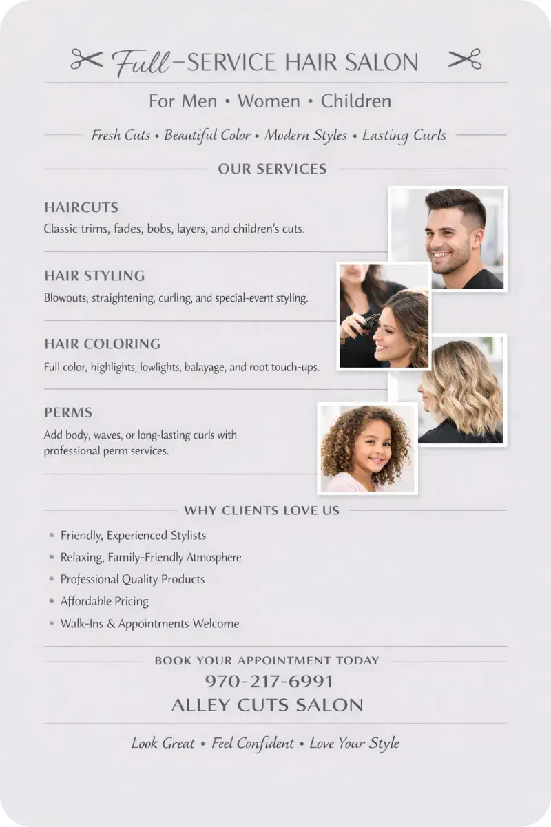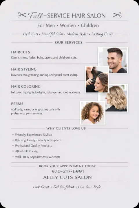 ️ FULL-SERVICE HAIR SALON ️For Men • Women • ChildrenFresh Cuts • Beautiful Color • Modern Styles • Lasting CurlsOUR SERVICESHAIRCUTSClassic trims, fades, bobs, layers, and children’s cuts.HAIR STYLINGBlowouts, straightening, curling, and special-event styling.HAIR COLORINGFull color, highlights, lowlights, balayage, and root touch-ups.PERMSAdd body, waves, or long-lasting curls with professional perm services.WHY CLIENTS LOVE US• Friendly, Experienced Stylists• Relaxing, Family-Friendly Atmosphere• Professional Quality Products• Affordable Pricing• Walk-Ins & Appointments WelcomeBOOK YOUR APPOINTMENT TODAY970-217-6991ALLEY CUTS SALONLook Great • Feel Confident • Love Your Style